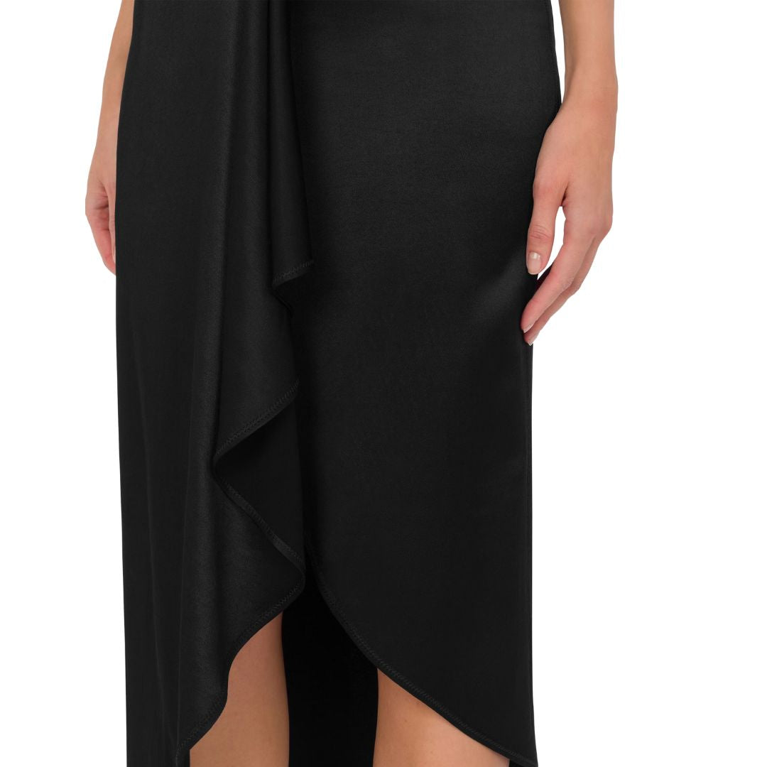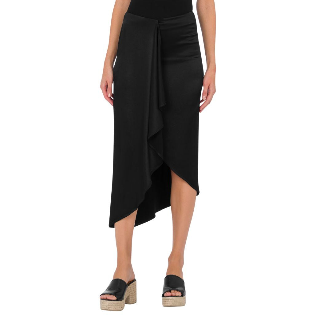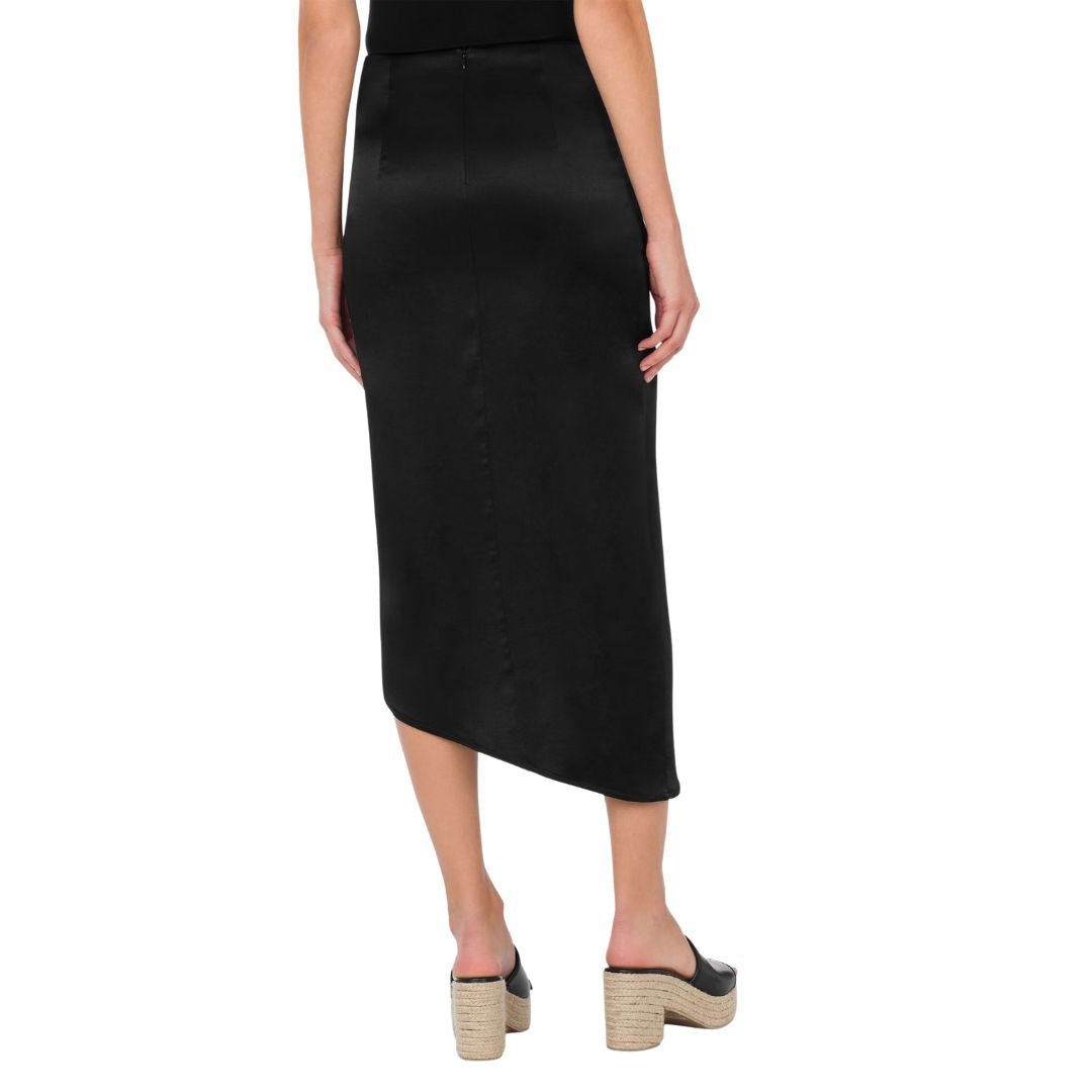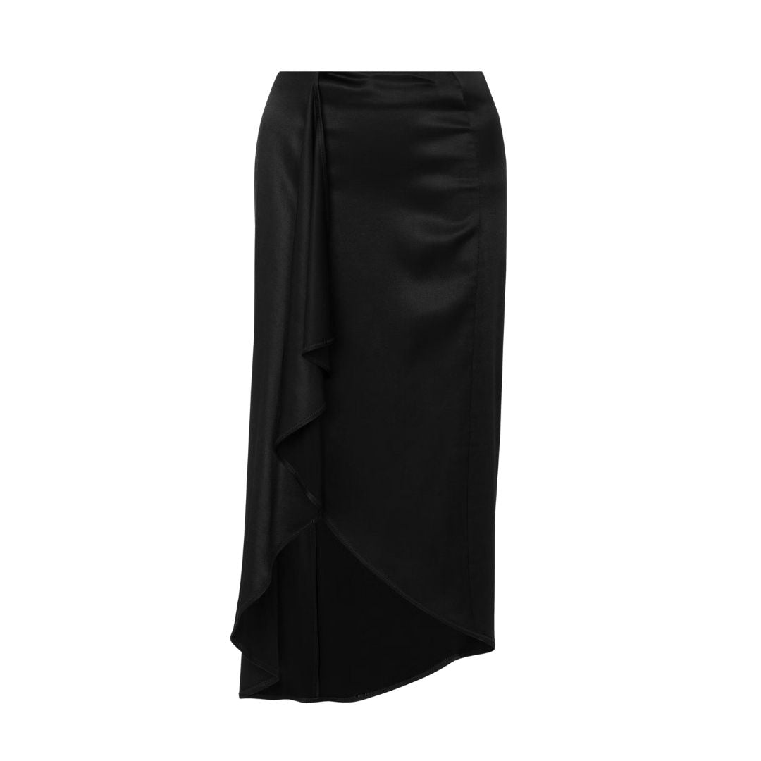 A skirt crafted from stretch viscose satin featuring elegant ruches and an intriguing asymmetrical hem. Designed with a mid-rise waist for a flattering fit, it is secured with a discreet side zip fastening.