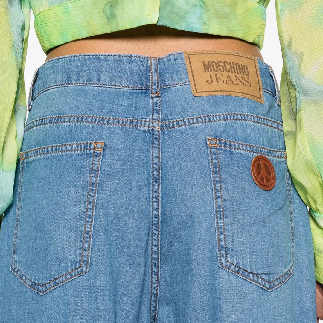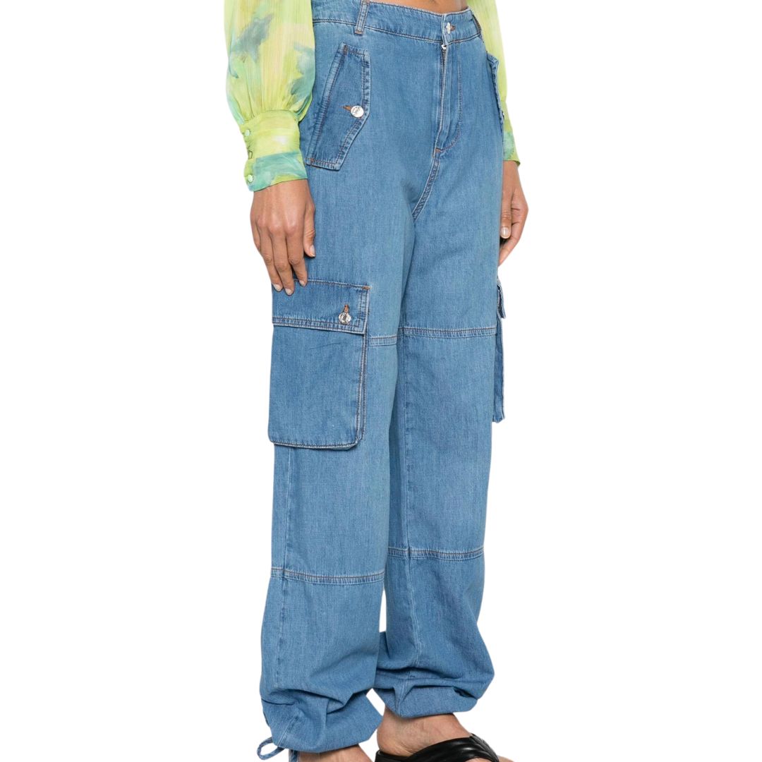 These denim cargo jeans boast a high-rise design, crafted from durable blue cotton denim. Complete with a logo patch at the rear, they feature belt loops, a concealed fly and button fastening, and a practical array of pockets including two side flap pockets, two side cargo pockets, and two rear patch pockets. With a wide-leg silhouette and drawstring ankles, they blend style with functionality seamlessly.