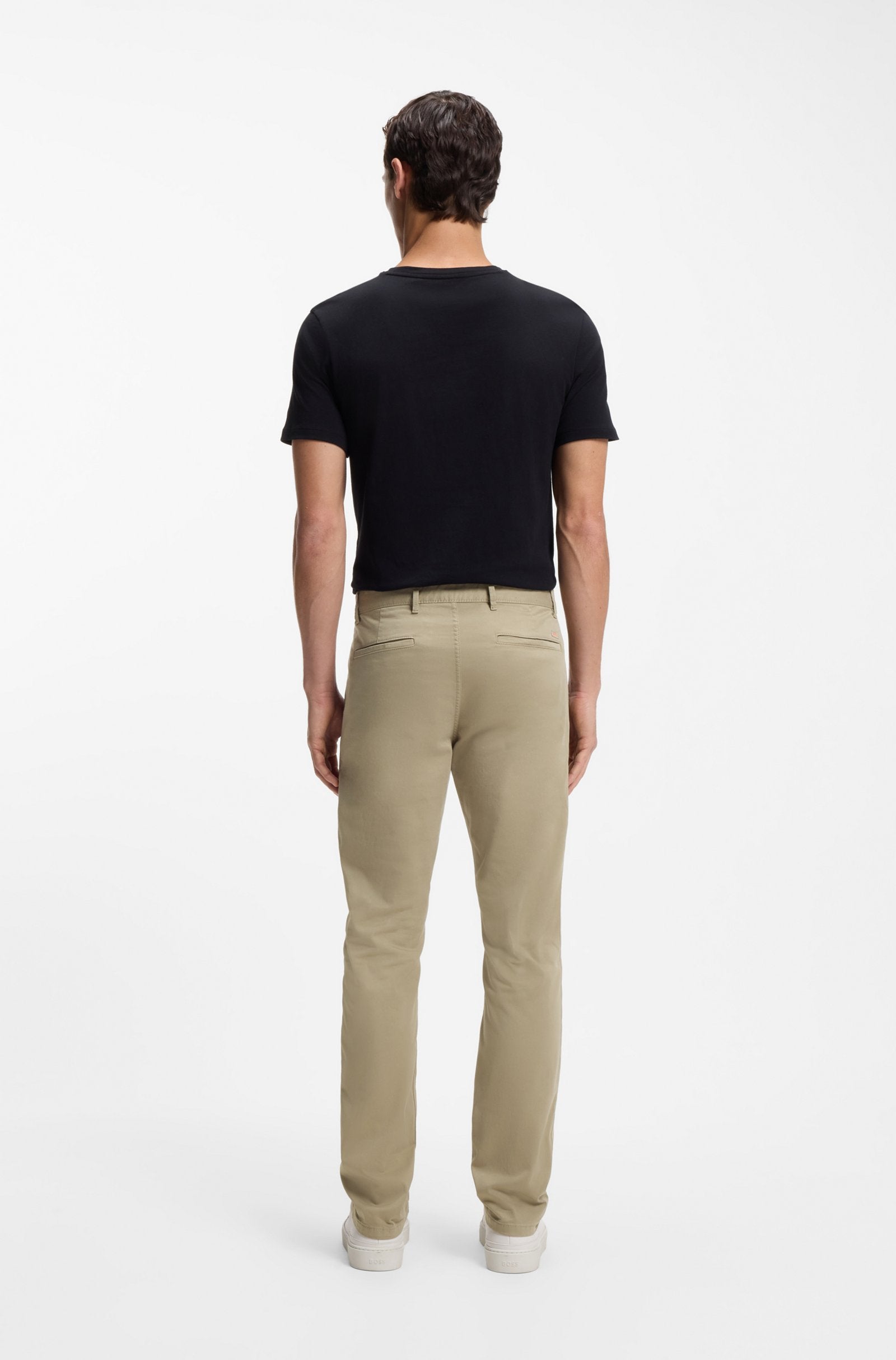 The BOSS Slim Fit Chinos in a refined slim fit, tailored from soft, overdyed satin cotton blend with subtle stretch for all-day comfort. The regular rise and slim leg create a contemporary silhouette, while French front pockets and welted back pockets offer practical styling. Finished with signature rear logo trim and unlined construction for a lightweight feel, these men's chinos that transitions effortlessly from casual to smart-casual occasions.