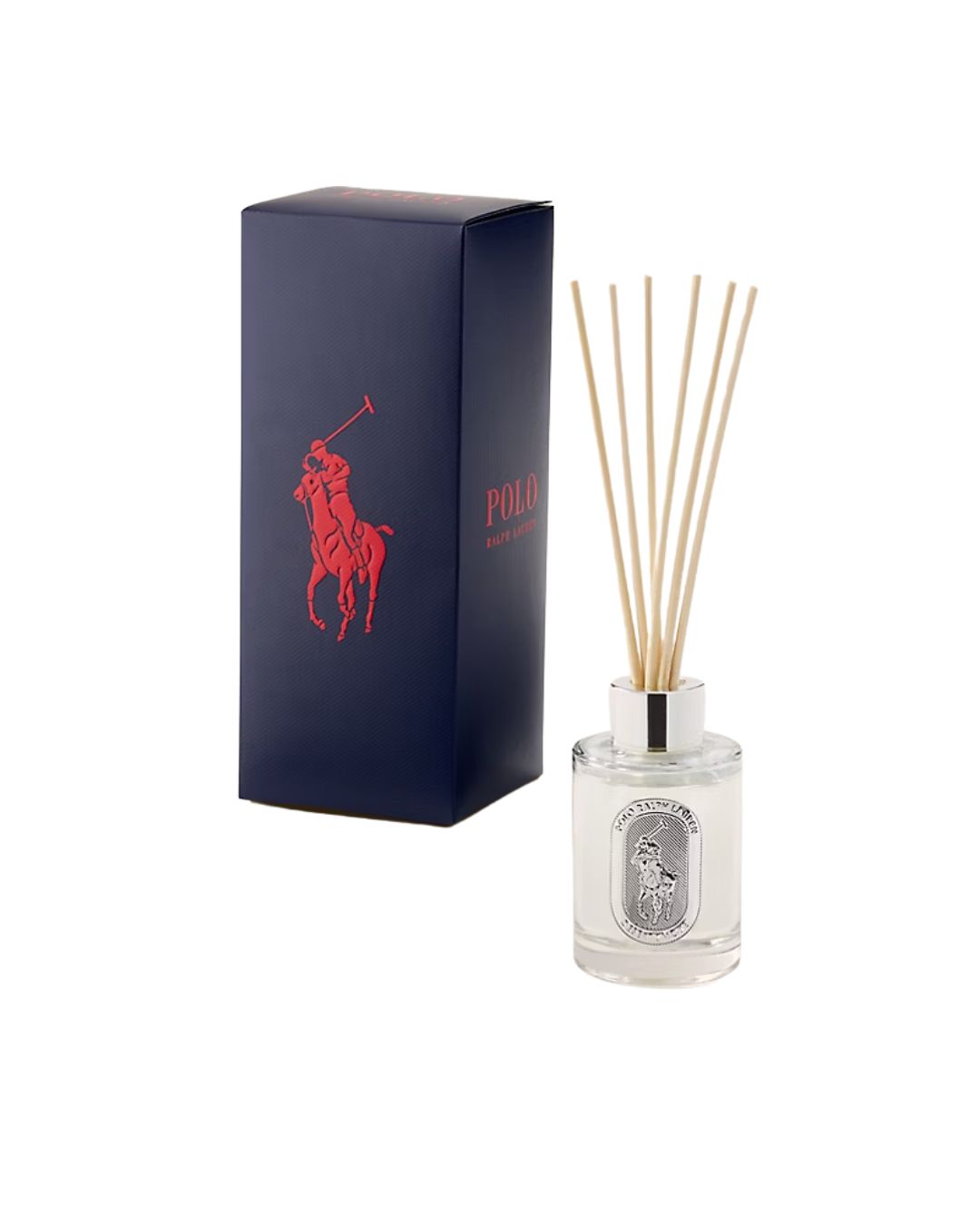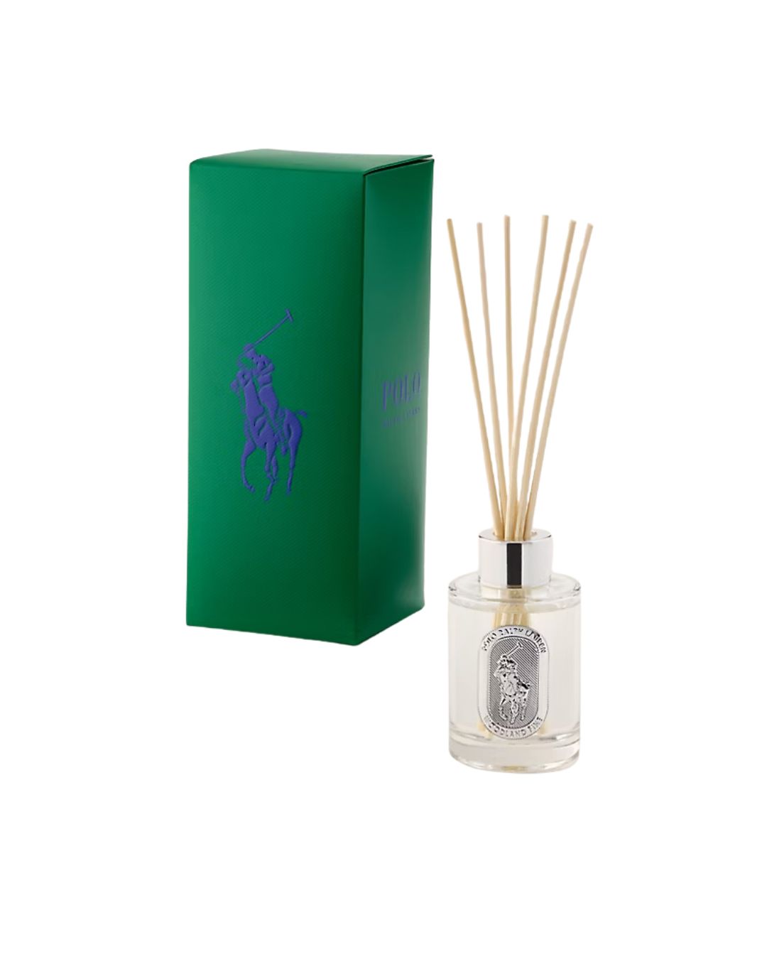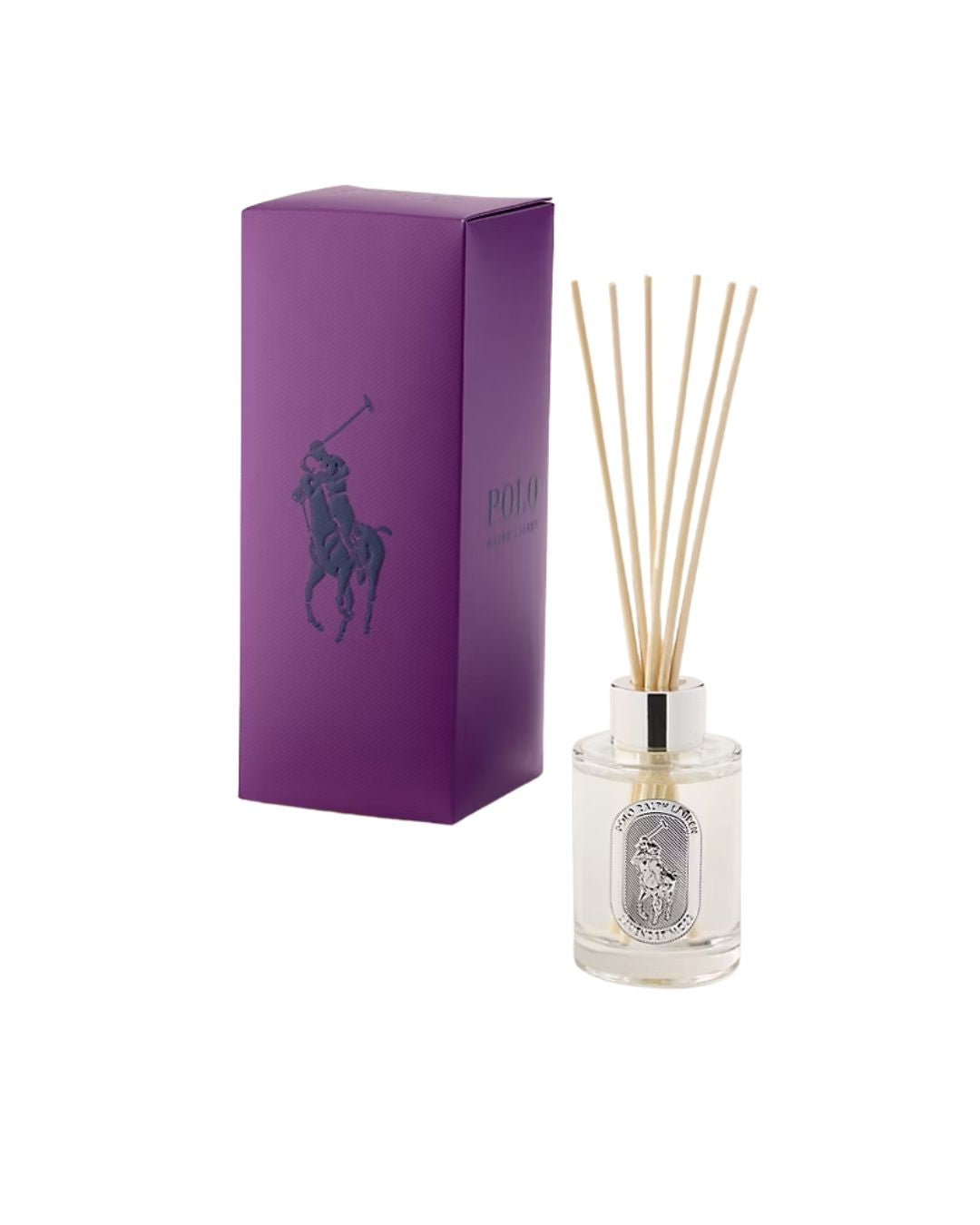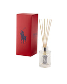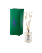 Includes five wooden reed sticks and housed in a glass vessel adorned with a metal emblem showcasing Ralph Laurens signature Pony and logo.