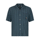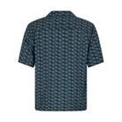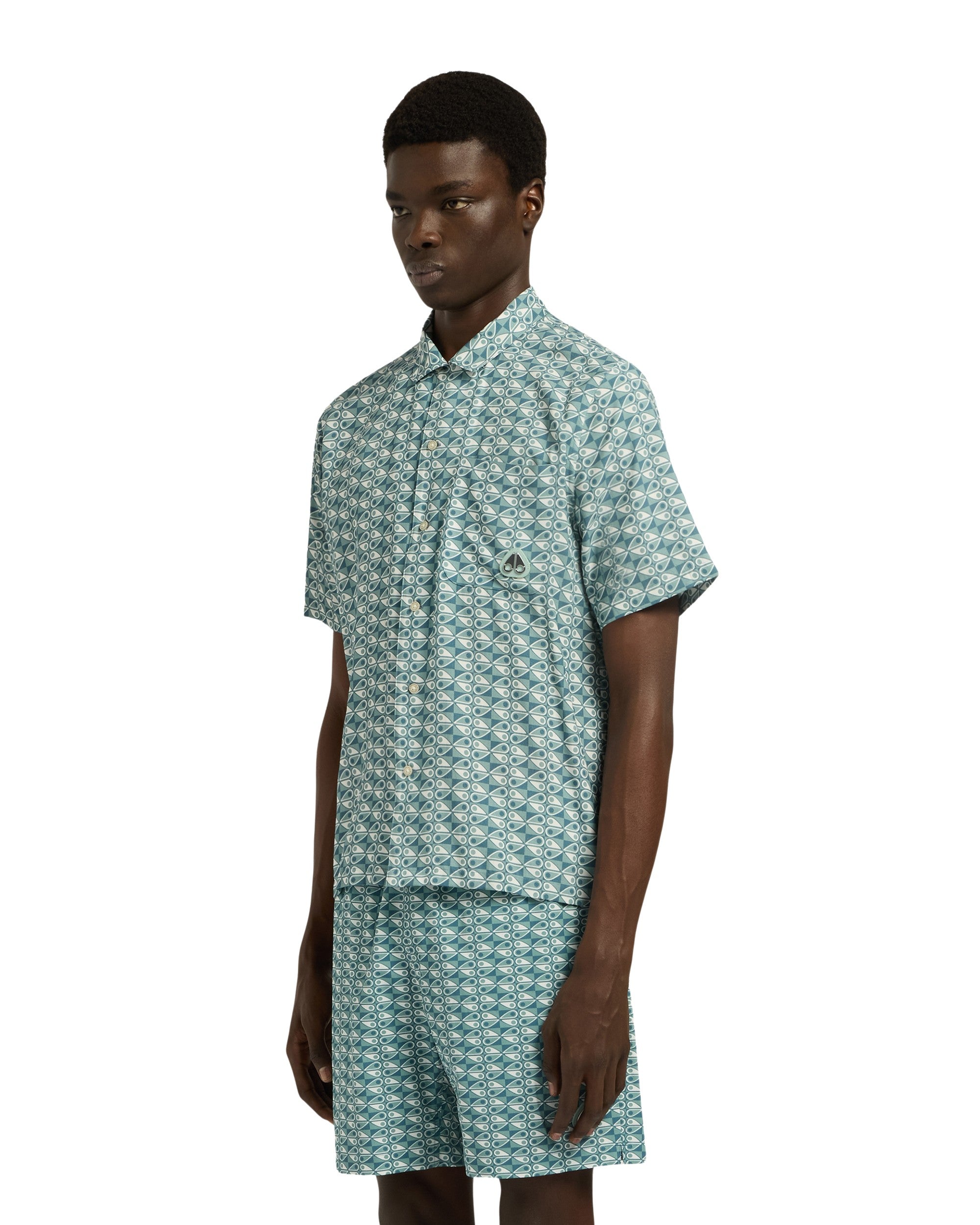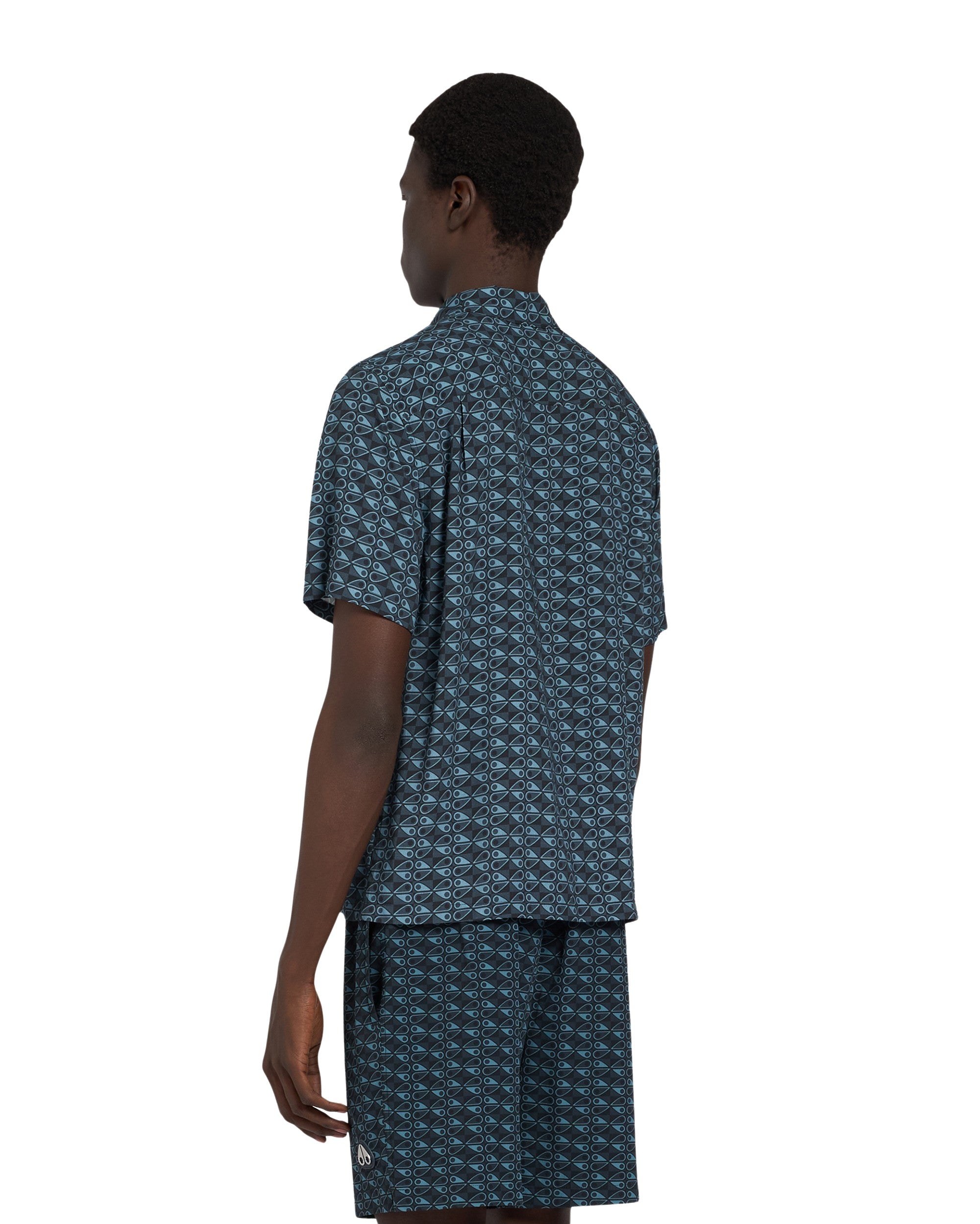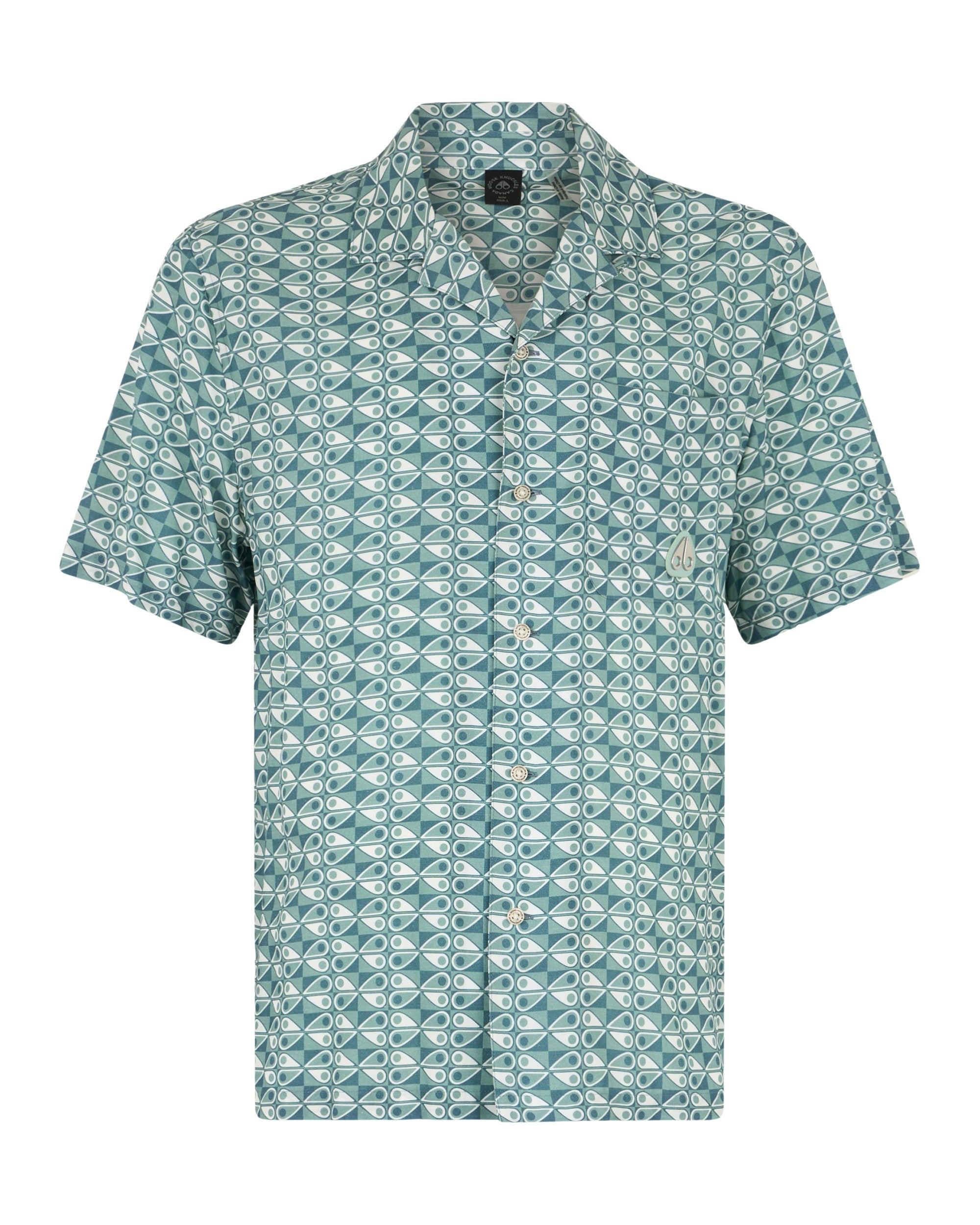 A regular-fit shirt featuring a full button fastening and a Cuban collar with short sleeves. The shirt is adorned with an all-over Moose Knuckles logo design and includes a chest pocket with a metal Moose Knuckles logo badge. A matching swim short is also available.
