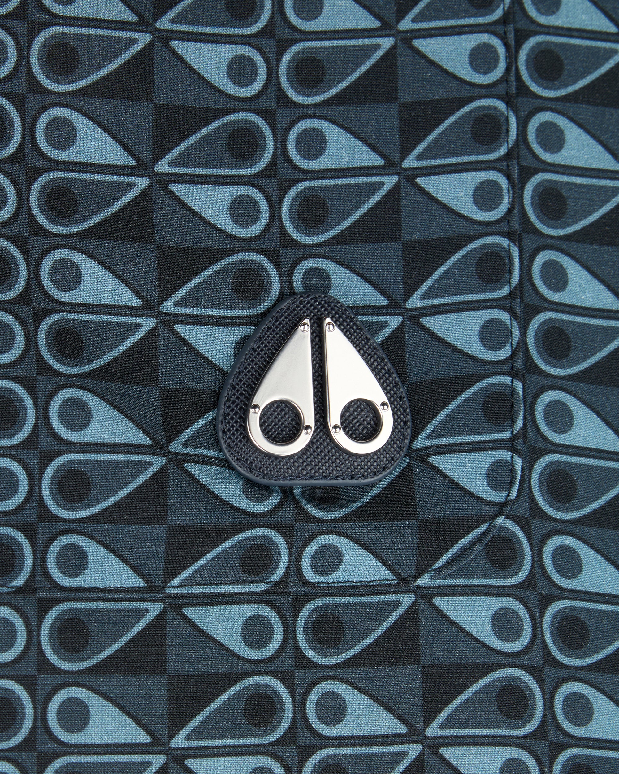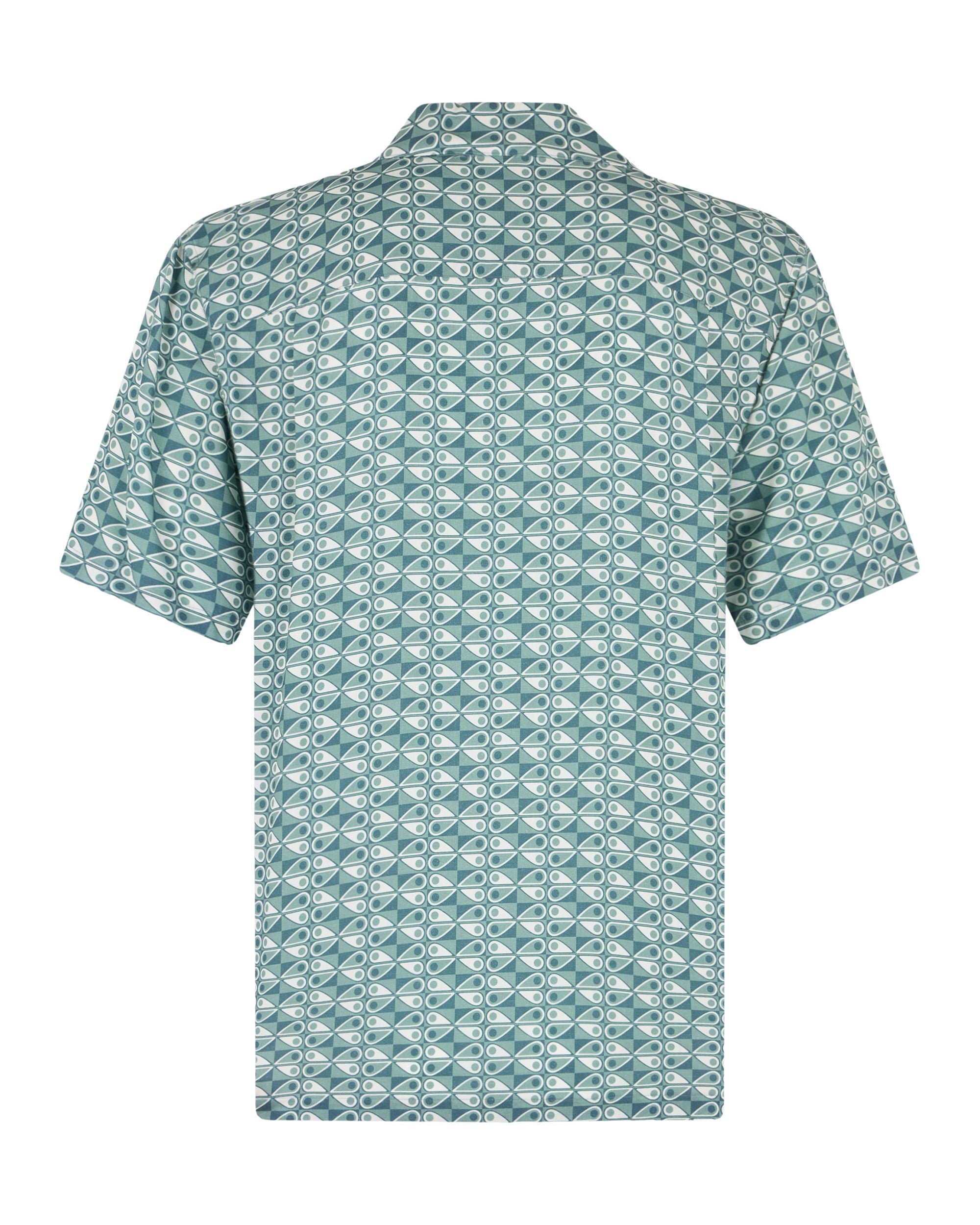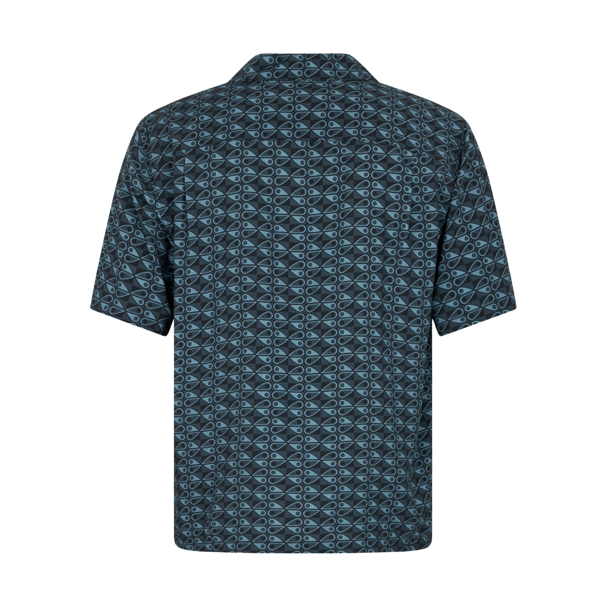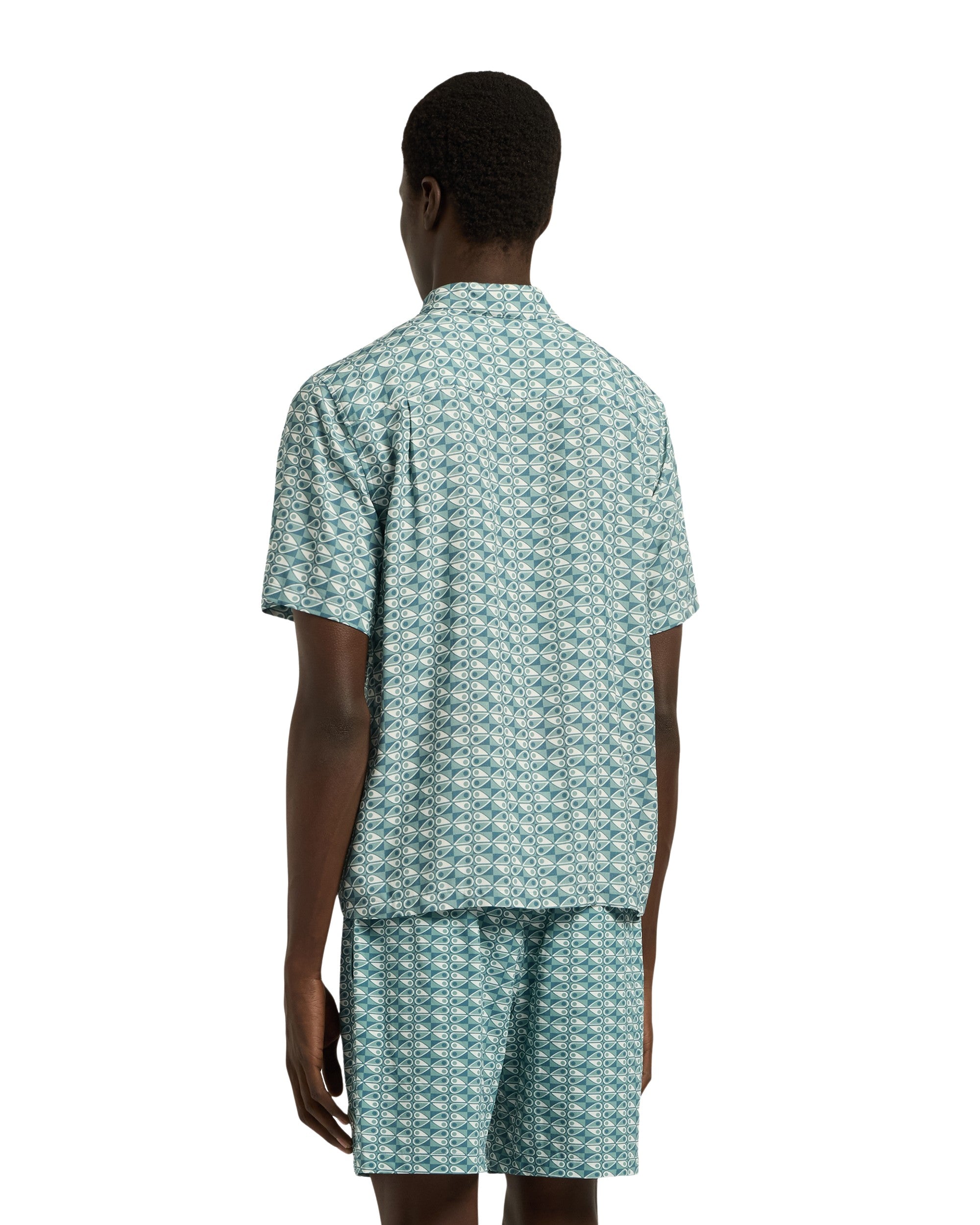 A regular-fit shirt featuring a full button fastening and a Cuban collar with short sleeves. The shirt is adorned with an all-over Moose Knuckles logo design and includes a chest pocket with a metal Moose Knuckles logo badge. A matching swim short is also available.